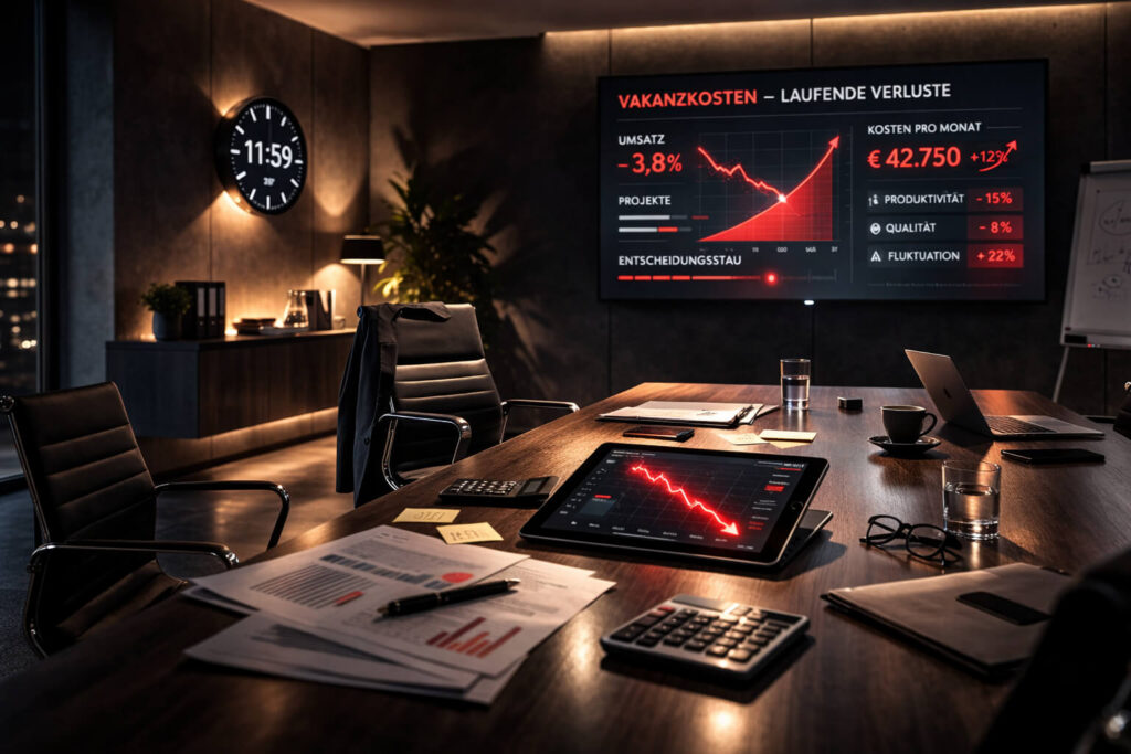 Wenn eine Schlüsselposition im Unternehmen unbesetzt bleibt, ist die erste Reaktion häufig dieselbe: So ist der Markt. Wir arrangieren uns. Aufgaben werden verteilt, Kollegen springen ein, der Betrieb läuft irgendwie weiter. Und für einen kurzen Moment scheint es sogar so, als würde man Kosten sparen – schließlich wird das Gehalt ja nicht gezahlt. Doch dieser Trugschluss ist einer der teuersten Denkfehler, den Unternehmen im Umgang mit Vakanzen begehen. Denn Vakanzkosten entstehen nicht erst, wenn etwas sichtbar schiefläuft – sie entstehen ab dem ersten Tag, an dem eine wirkungsrelevante Rolle unbesetzt bleibt.